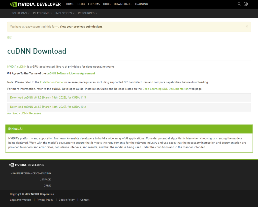 4、去Nvidia官方网站下载cuDNN:https://developer.nvidia.com/cudnn,先注册才能下载,目前的版本是:cudnn-windows-x86_64-8.3.3.40_cuda11.5-archive.zip。